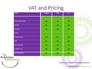 This illustration for B2C shows what happens when you decide not to increase your prices. Furthermore the price you charge your customer is assumed to inclusive of VAT. Hence, you absorb it, and profits suffer. Example, the profit before is £480, as a result it drops to £380 after registering.